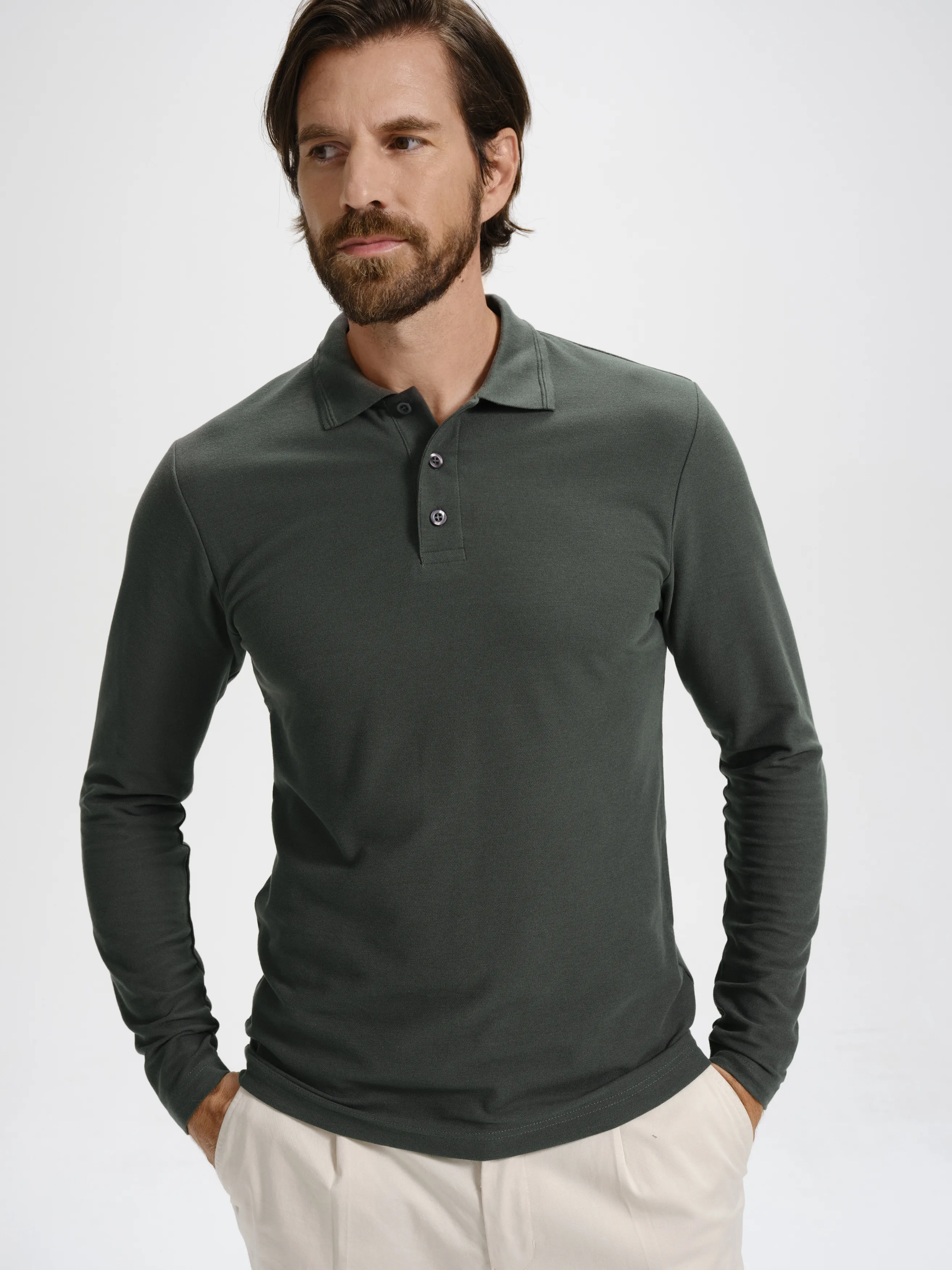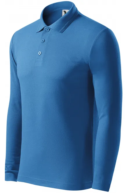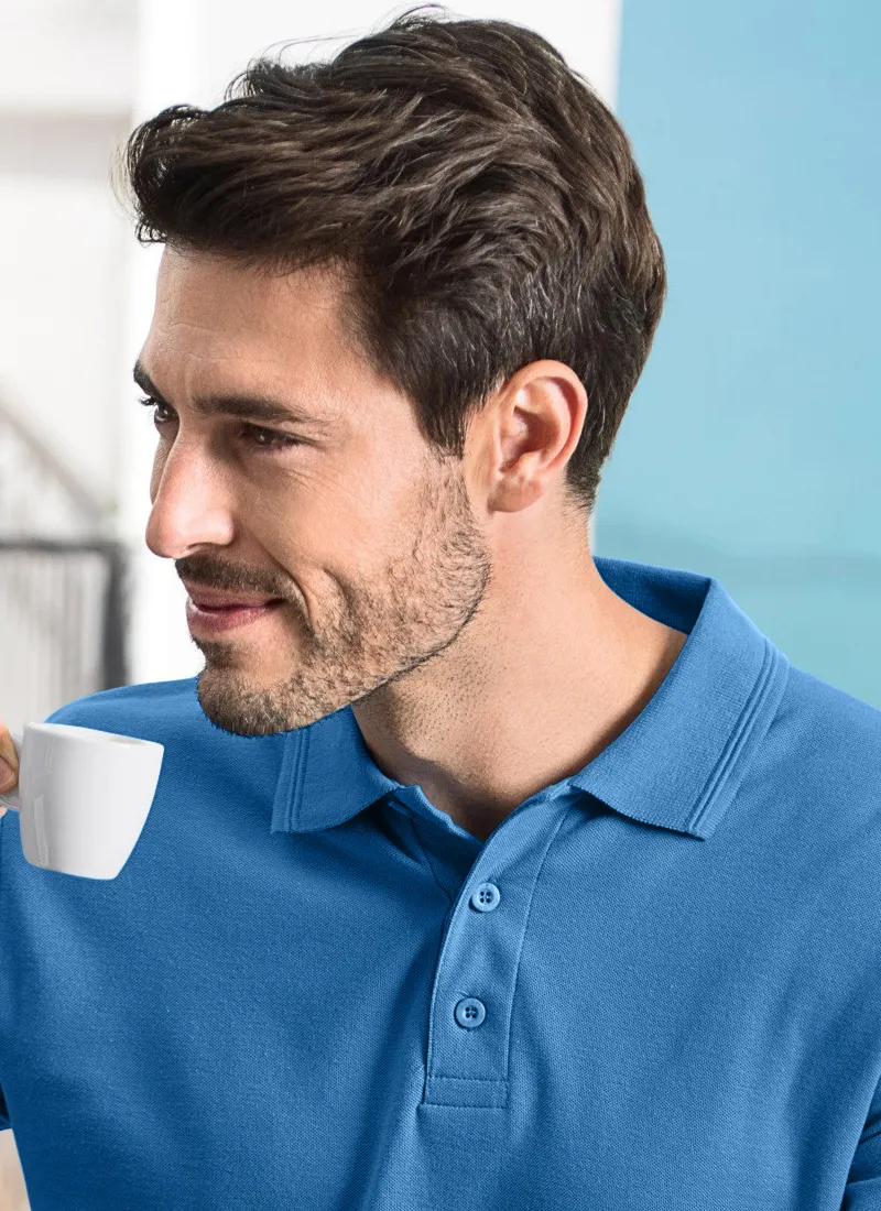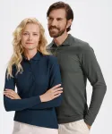 El polo de manga larga para hombre está confeccionado con un material más grueso compuesto por un 65% de algodón y un 35% de poliéster para una máxima comodidad durante todo el día.